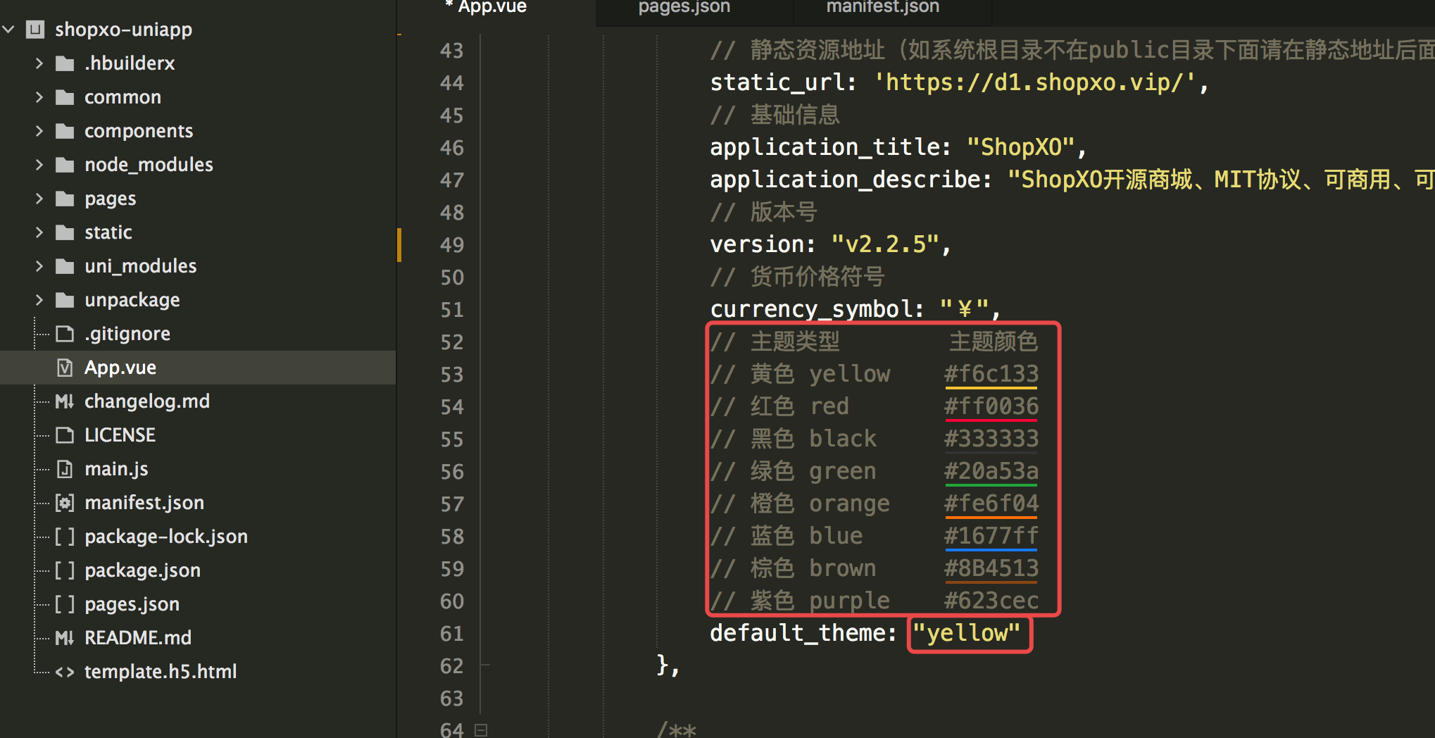 主题修改(可选):默认为红色(red),如更改主题 App.vue文件中 default_theme 默认主题标识,也可以到商店搜索【默认主题样式】远程控制主题配色