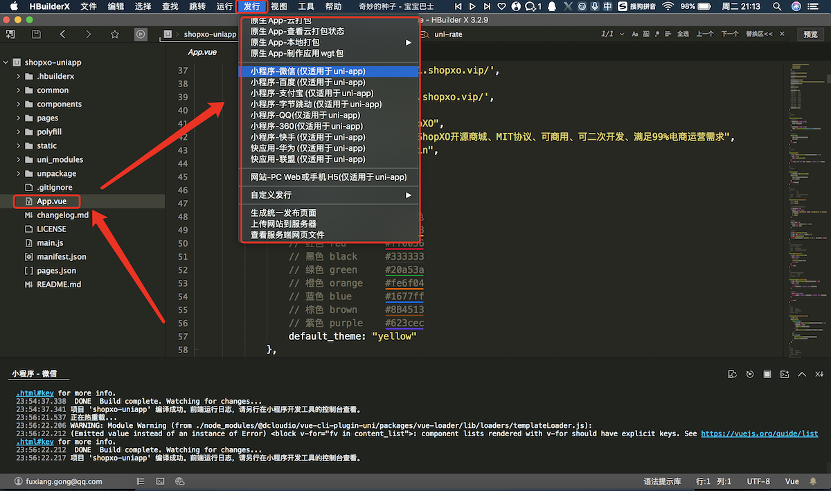 其他端小程序工具:在HBuilderX工具编译成功后需手动导入项目运行,源码位置(shopxo-uniapp/unpackage/dist/build/xxx)如支付宝小程序xxx则是(mp-alipay)。