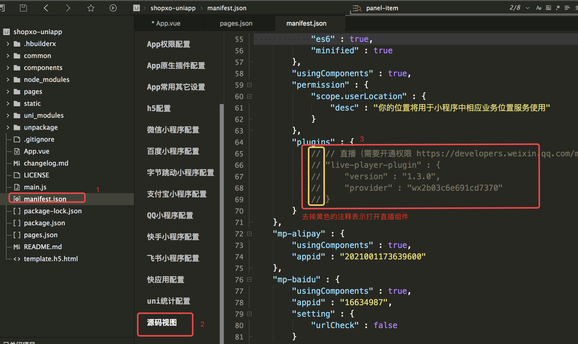 1. 中修改对应终端配置,比如小程序appid(微信小程序直播、好物推荐配置都在这里面自行去掉注释、一定要先申请权限、不然小程序空白)